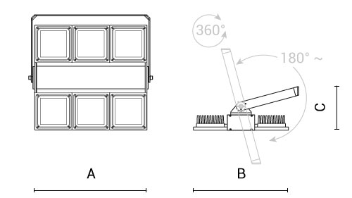 asimmetrica Imax=40° | 430W | 42300lm | 4000K | 80 | ON/OFF | 598mm | 557mm | 255mm |