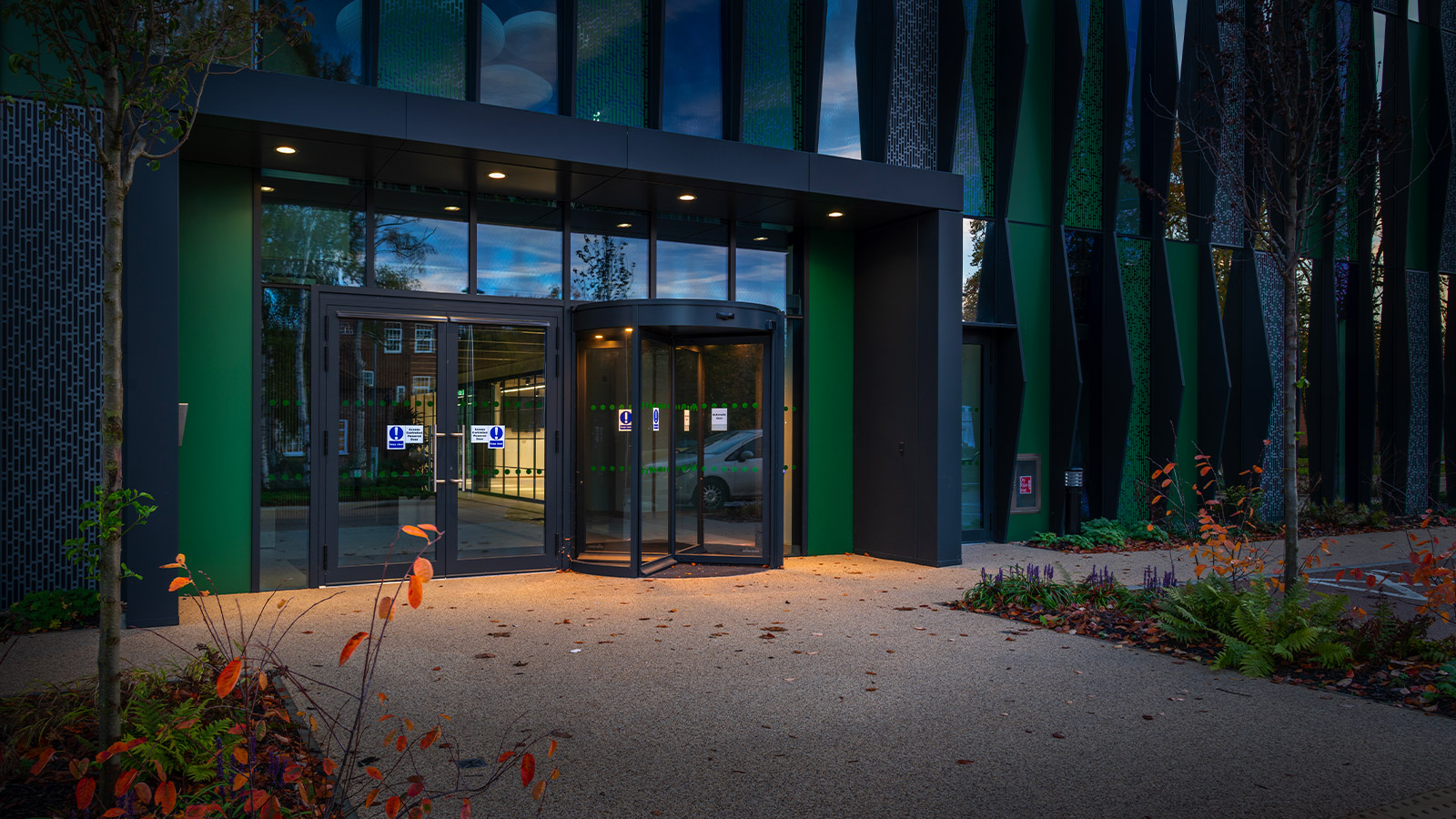 Arcluce illumina con il proiettore DUEVENTI e i downlight RAY180short gli spazi esterni del campus Harwell Campus in Inghilterra